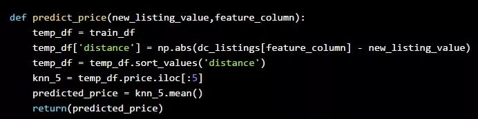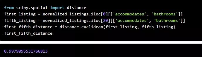 让我们通过定义我们将要使用的相似性度量来开始构建我们的真实模型。然后,我们将实现k最近邻算法,并使用它来给出一个新房源的价格。出于本教程的目的,我们将使用一个固定的k值5,但是一旦你熟悉了这个算法的工作流,你就可以对这个值进行试验,看看用更低或更高的k值是否可以得到更好的结果。