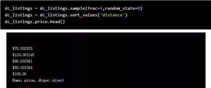 如果我们只使用距离为0的前5个值,我们的预测将偏向于数据集的现有顺序。相反,我们将随机化观测值的顺序,然后选择距离为0的前5行。我们将使用 DataFrame .sample() 来随机化行。这个方法通常用于选择DataFrame的一个随机部分,但是我们将告诉它随机选择100%,这会为我们随机打乱行。