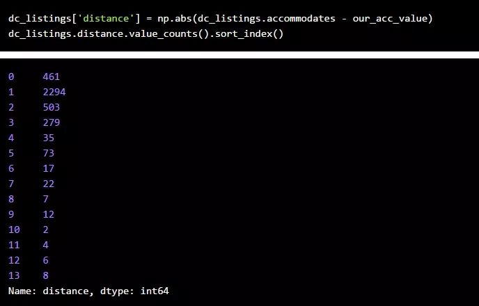 我们首先只使用accommodates特征来计算数据集中第一个居住空间与我们自己的居住空间之间的距离。我们可以使用NumPy函数np.abs() 来获得绝对值。