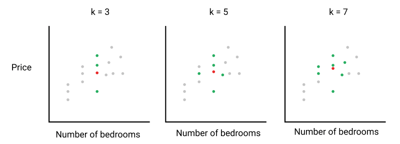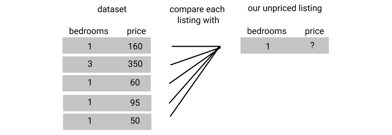 K最近邻(KNN)算法的工作原理类似于我们前面概述的三步过程,该过程将我们的出租房屋与类似房源进行比较,并取平均价格。让我们来看看它的一些细节: