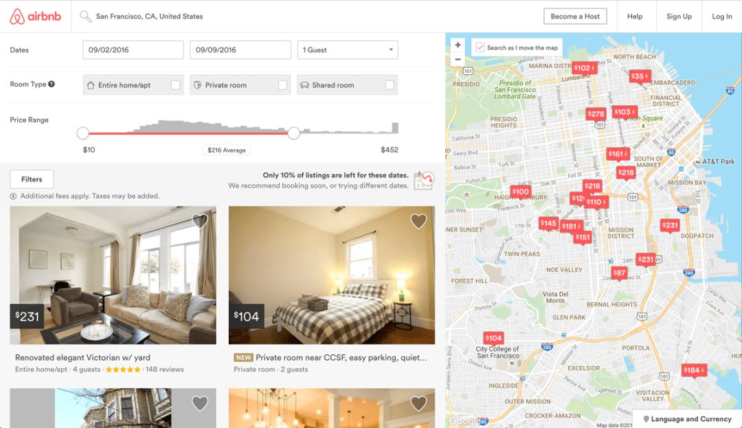 Airbnb房东面临的一个挑战是确定最优的夜间租金。在许多地区,潜在的租房者会看到一系列不错的房源清单,可以根据价格、卧室数量、房间类型等标准进行筛选。由于Airbnb是一个市场,主人每晚可以收取的费用与市场的动态密切相关。以下是一个Airbnb搜索体验的截图: