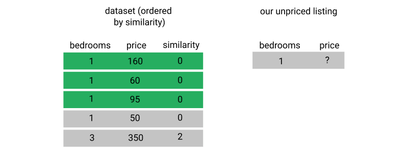 为了简单起见,上面的图片的每个观察只使用了两个特征(卧室数和价格)来与我们的房源进行比较,而机器学习的好处在于,我们可以通过评估每个观察的更多特征来进行更复杂的比较。