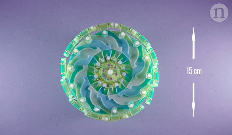 据悉,在单个机器人的设计上,研究人员选择简单的“盘状”造型,它们由“粒子”构成,且不能做平面移动,只可像相机光圈一般做伸缩运动。但当它们聚集一起后,研究人员只要给它们光线刺激,整个系统就会对这一信号做出响应,并按照偏移模式振荡,集体朝着刺激源移动。