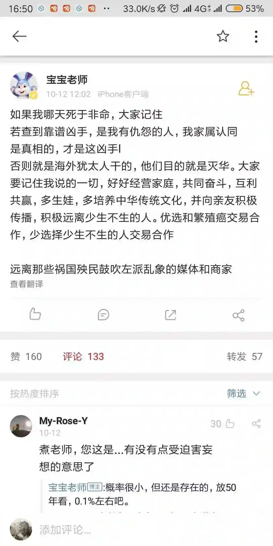 有了这么多“优质”子嗣,徐总担心自己死于非命。“不是我的仇人,就是灭华的海外犹太人干的。”网友问他是不是有被迫害妄想症,他称概率很小但还是存在。