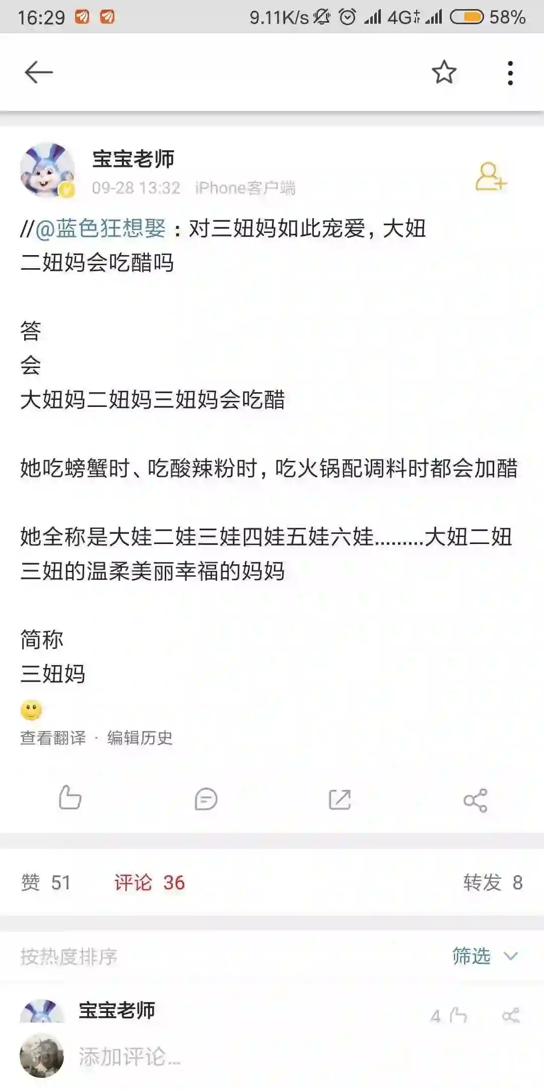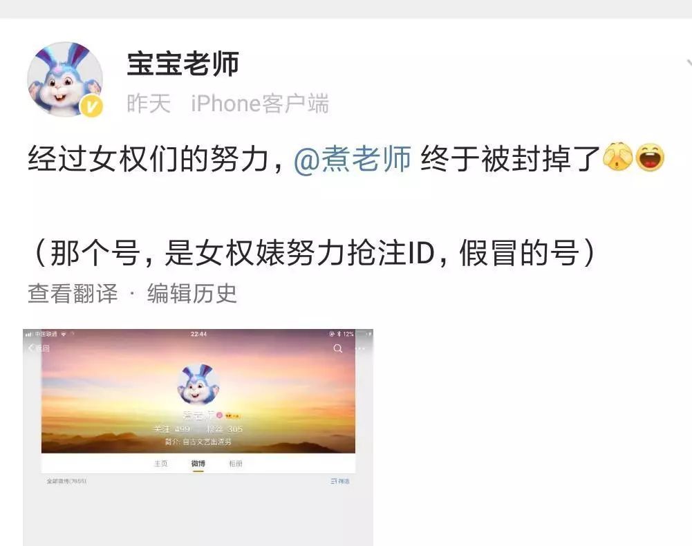 他现在的微博名叫@宝宝老师,之前是@煮老师,再之前是@煮肘。