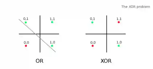 经过最初的炒作一年之后,Marvin Minsky 和 Seymour Papert 击碎了这个想法(1969, Minsky & Papert)。当时,Minsky 和 Papert 都在麻省理工学院的 AI 实验室工作。他们写了一本书,证明感知机只能解决线性问题。他们还批判了关于多层感知机的想法。可悲的是,Frank Rosenblatt 两年后因船难去世。