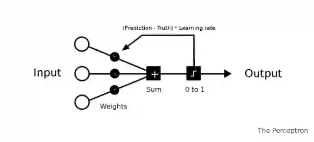 如上图所示,每个训练周期都是从左侧输入数据开始。给所有输入数据添加一个初始的随机权重。然后将它们相加。如果总和为负,将其输出为 0,否则输出为 1。
