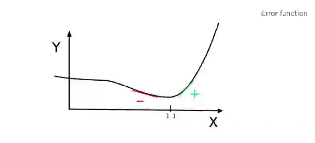 假设 Legendre 的算法需要考虑一个参数 —— 我们称之为 X 。Y 轴表示每个 X 的误差值。Legendre 的算法是找到使得误差最小的 X。在下图中,我们可以看到当 X = 1.1 时,误差 Y 取到最小值。