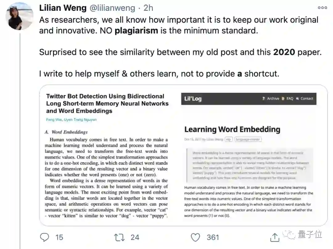 目前就职于OpenAI的Lilian Weng也发推表示,自己的博客同样被这位作者的另一篇论文抄袭。