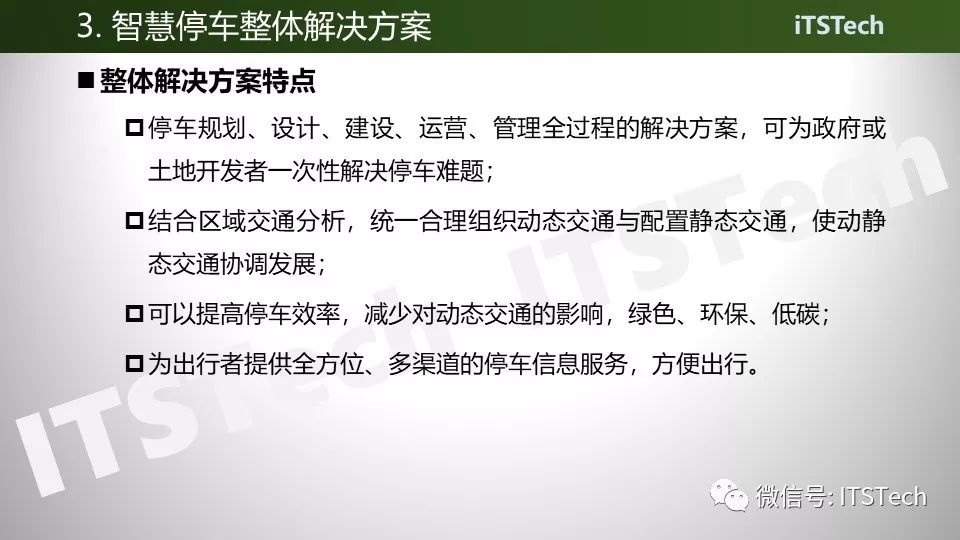 停车问题涉及到土地利用、投资、运营等方方面面问题,是个复杂大系统问题,因此需要综合的解决方案。本整体解决方案包括停车规划、停车场内外部交通设计、停车组织与管理、智能停车系统、停车运营服务、投资等方面,涵盖停车技术的各个方面,能够提供停车一揽子解决方案。