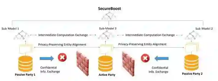 这篇论文中作者们提出了一个基于联邦学习的,新的无损、保护隐私的提升树(tree-boosting)系统 SecureBoost 安全树模型。它可以让多个机构的学习过程共同进行,用户样本只需要有一部分相同,但可以使用完全不同的特征集,相当于对应了不同的垂直分组的虚拟数据集。SecureBoost 安全树模型的优点是,它在训练数据保持多方相互保密的前提下,可以达到和不保护隐私的方法相同的性能;而且这个过程还不需要一个共同信任的第三方参与。
