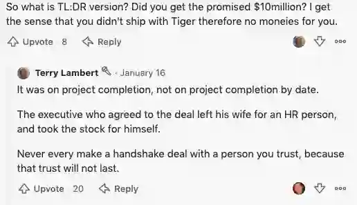 尽管如此,Lambert 在评论区透露,自己由于一些原因最终并未获得预期中的 1000 万美元股份。