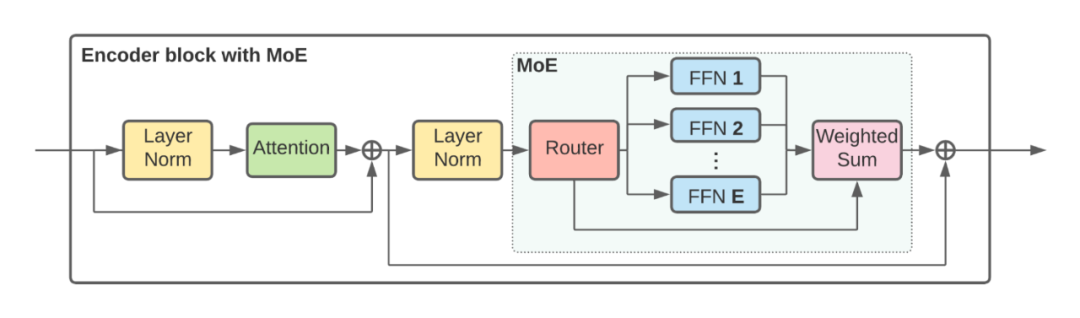 。可学习的路由层为每个独立的 token 选择对应的专家。也就是说,来自同一图像的不同 token 可能会被路由到不同的专家。在总共 E 位专家(E 通常为 32)中,每个 token 最多只能路由到 K(通常为 1 或 2)位专家。这允许扩展模型的大小,同时保持每个 token 计算的恒定。下图更详细地显示了 V-MoE 编码器块的结构。