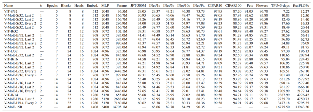 谷歌大脑在 ViT 的不同变体上构建 V-MoE:ViT-S(mall)、ViT-B(ase)、ViT-L(arge) 和 ViTH(uge),其超参数如下: