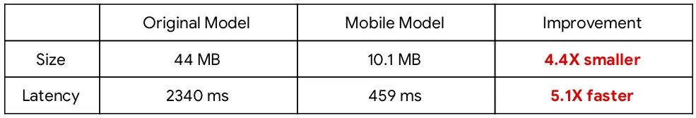 敲定模型架构后,我们使用 TensorFlow 模型优化工具包,通过量化来进一步缩小移动模型。量化是适用于大多数 TensorFlow 模型移动部署的一项重要技术,在本例中,它可将模型大小缩小为原来的 1/4,在大幅加速模型推理的同时,对质量的影响很小。