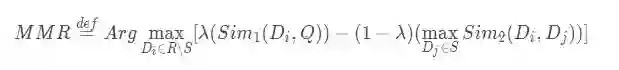 我们首先看一个非单调submodular函数做摘要的例子。论文中给出了MMR的例子,关于MMR(Maximal Marginal Relevance)算法,同样在我之前的文章中有详细介绍,这里就不重复描述了,仅给出其公式: