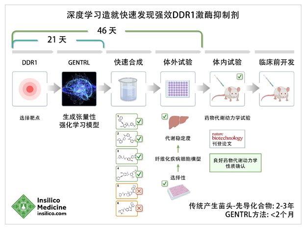 这篇论文介绍了一种名为生成性张量强化学习(GENTRL)的新 AI 系统,该 AI 系统的「惊人之处」在于——从最初的靶点确定,到完成苗头化合物结构的虚拟筛选,仅用时 21 天;到苗头化合物的合成及初步体外实验验证,用时仅 46 天——这种方法比传统制药公司的研发过程快 5-10 倍。 具体来讲,DDR1 是一种与纤维化及其他疾病有关的激酶靶标,而该 AI 系统仅在 21 天内就设计出 6 种全新的靶向 DDR1 的潜在抑制剂小分子,其中 4 种通过生化检测证实具有活性,2 种通过细胞测定证实具有活性。