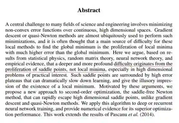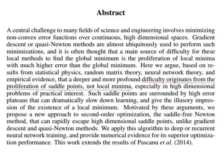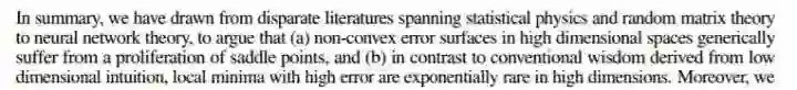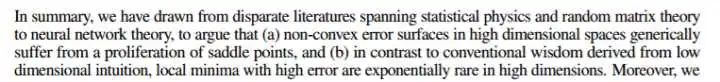 到2014年,一篇论文《Identifying and attacking the saddle point problem in high-dimensional non-convex optimization》[2],指出高维优化问题中根本没有那么多局部极值。作者依据统计物理,随机矩阵理论和神经网络理论的分析,以及一些经验分析提出高维非凸优化问题之所以困难,是因为存在大量的鞍点(梯度为零并且Hessian矩阵特征值有正有负)而不是局部极值。