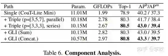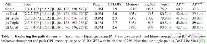 为了保持可比性的参数和FLOPs,增加路径的数量需要减少通道C或层数L(即,transformer encoder的数量)。作者通过减少C而不是L,从单路径(即CoaT-Lite baseline)扩展到triple-path。在消融研究中,验证了减少C比减少L获得更好的性能(见表5)。由于stage2的特征分辨率较高,导致计算成本较高,作者在stage2中将triple-path模型的路径数设置为2。从stage3开始,三路径模型有3条路径。