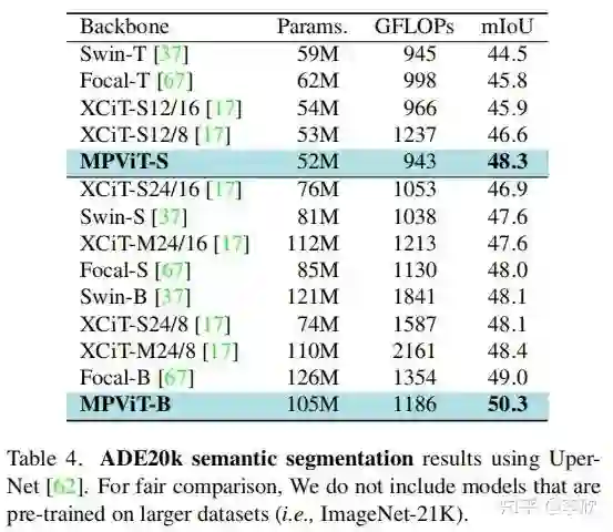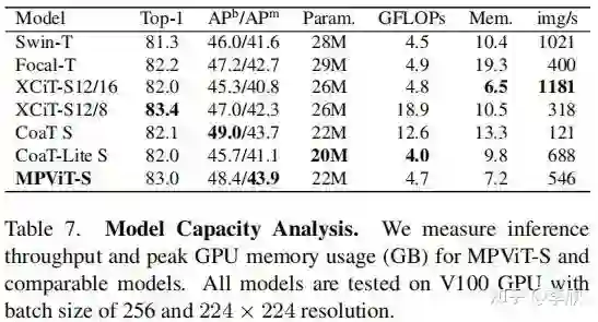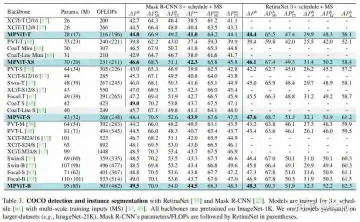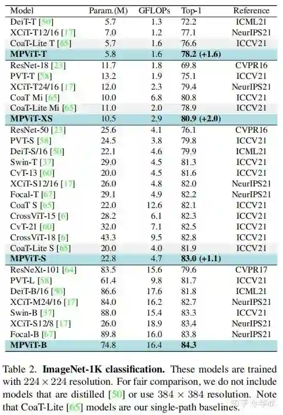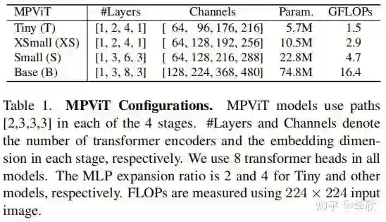 作者还发现,虽然 triple-path和双路径在ImageNet分类中产生相似的精度,但 triple-path模型在密集预测任务中表现出更好的性能。因此,建立了基于 triple-path结构的MPViT模型。MPViT的详细情况见表1。