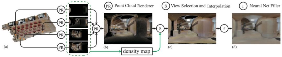 另一种方法是直接从真实环境中采集图片,把渲染的问题定义为「视角合成」问题,即给定几个从已有的视角采集的图片,合成一个新的视角。我们采用了这种方法作为渲染方法,示意图如下: