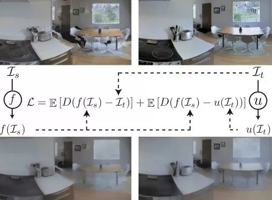 我们项目的另一个创新是把像素级域适应 (pixel level domain adaptation) 的机制嵌入到渲染引擎当中。对于渲染图像 I_s 和真实图像 I_t,我们的后处理网络 f 可以让渲染图像看起来像真实世界中的照片,即 f(I_s)≈I_t。与此同时,我们还训练了另外一个网络 u,让真实世界中的照片看上去像我们的渲染图像,即 u(I_t)≈f(I_s)(此处「≈」仅非严谨地代表「相似」)。