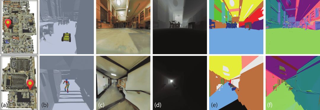 使用我们的开源平台来探索激活的和真实世界的感知。上图展示了 Gibson 中的两个智能体。这两个智能体是激活的、嵌入式的,并服从物理定律和空间(a,b)的约束。它们源源不断地接收视觉观察,就好像佩戴了摄像头,并以第一人称视角来观察环境(c)。除了(c)中的 RGB 通道模态,它们还能接收其它模态的观察,如(d)深度、(e)语义标签、(f)表面法线。该虚拟环境是通过扫描真实建筑得到的。