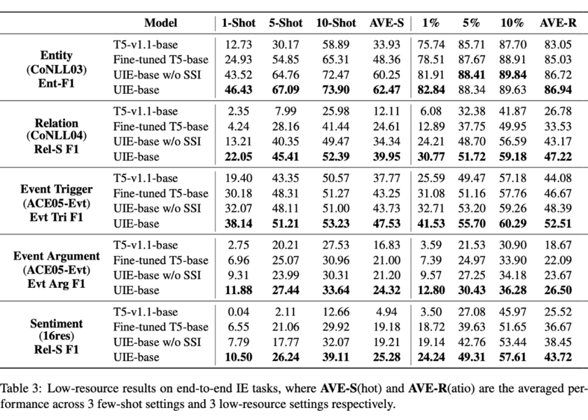 表格右数第二列是未经过UIE预训练的结果(基于T5+SEL直接微调),右数第一列是UIE预训练后微调的结果,可以看出SEL+强大生成模型就可以在信息抽取的统一建模方面取得很强的效果,而经过UIE预训练后则进一步提升了模型表现。