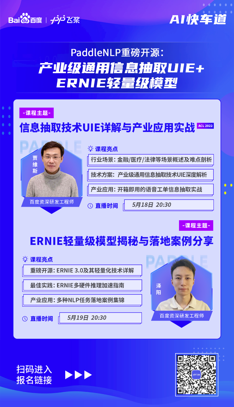 最后,百度高工会在5.18-5.19日针对信息抽取行业痛点,对UIE和PaddleNLP的玩法和潜力进行深入讲解,通过以下海报扫码预约,进群还有更多福利哦~