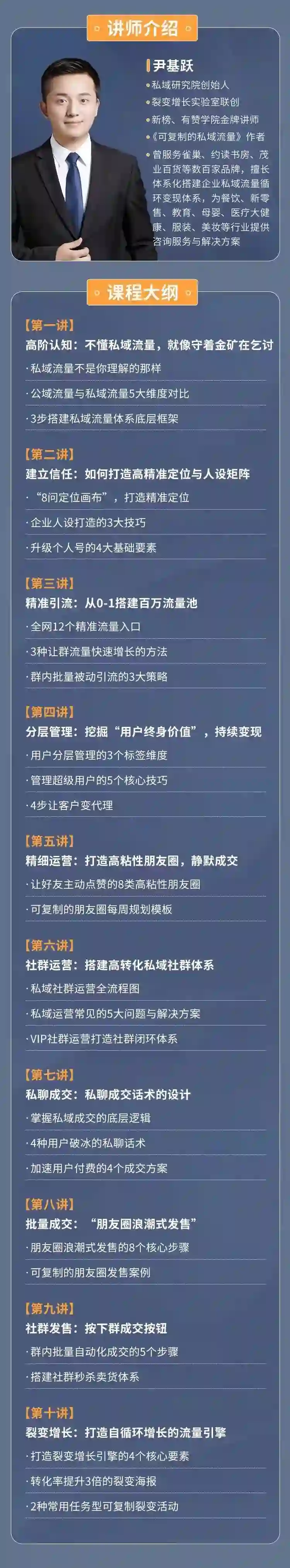 这门课程是尹基跃老师在操盘了数百个品牌的私域流量案例后总结出的可复制的方法论,是一套私域流量循环变现的运营体系。