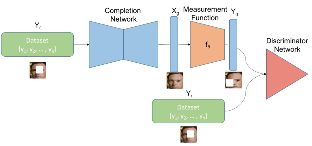 现在假定我们已经有不完整图片的样本,且我们知道添加到样本的噪声类型。我们可以使用加上掩码的图像作为补完网络(completion network)的输入而不是使用随机隐向量。假设补完网络成功生成了掩盖的区域,那么生成的图像块将使用掩码信息 X_g 与输入图像相结合。