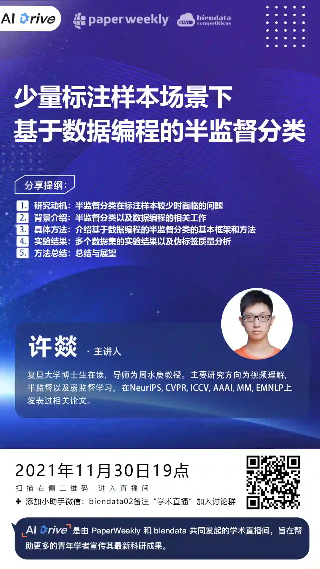 本期 AI Drive,我们邀请到复旦大学博士生许燚,为大家在线解读其发表在 NeurIPS 2021 的最新研究成果:DP-SSL: Towards Robust Semi-supervised Learning with A Few Labeled Samples。对本期主题感兴趣的小伙伴,11 月 30 日(本周二)晚 7 点,我们准时相约 PaperWeekly 直播间。