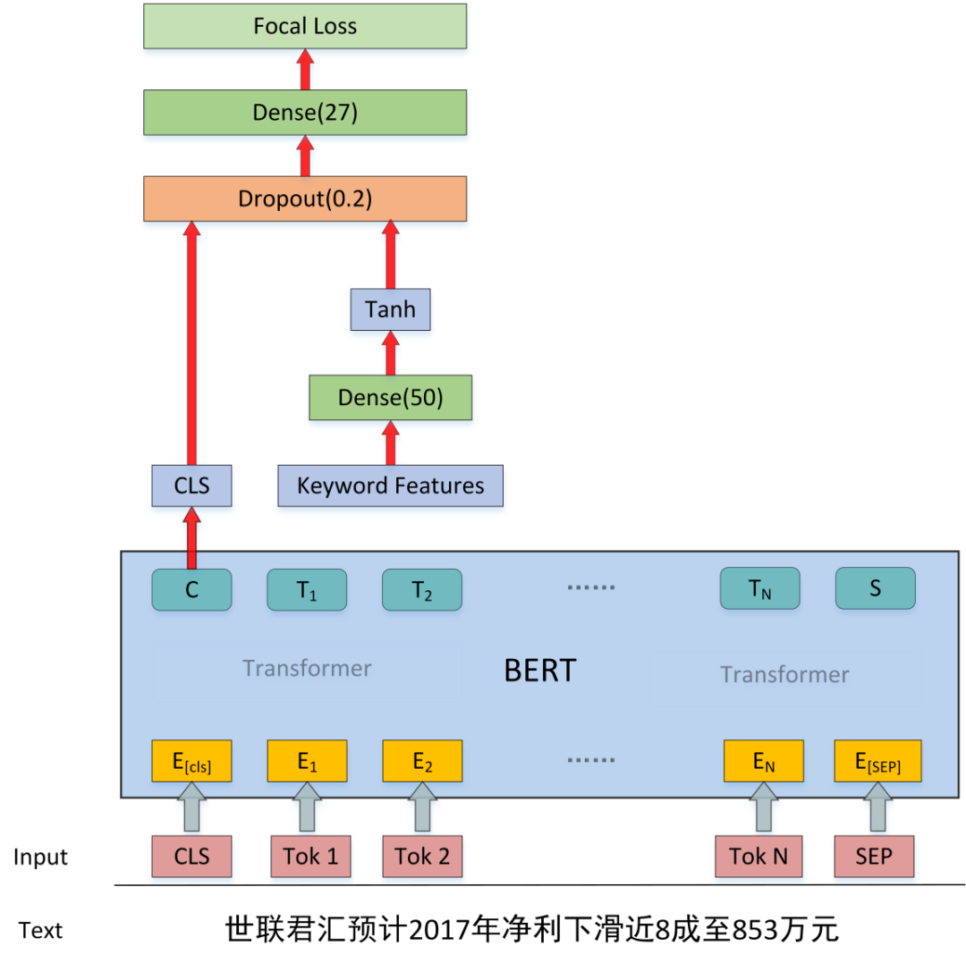 关键词特征提取。为了提升模型在样本较少和较难分辨的类别上的表现,我们手动提取了一部分与事件类别相关的关键词,对于一段输入文本,如果包含该关键词为1,不包含为0,由此,对于每一个句子,可以得到一个由0和1组成的向量,实际模型中,我们将这个向量通过线性层,激活函数后同CLS向量连接,再做分类。例如:假设关键词包含{担保,清偿,债务,收购,侵犯}5个,那么句子“2009年12月,中国长城科技集团股份有限公司资产管理公司上海办事处对公司申报的两笔历史连带担保债务,本公司实际控制人已于2010年2月及2013年8月承诺,如未来经法院裁定公司须承担相应的担保责任,承诺人将代公司承担其相应的担保责任,且不向公司主张任何权利。”的特征向量为[1, 0, 1, 0, 0]。实际实现时,按照模型对每个类别分类表现不同,我们共提取了168个关键词,在很大程度上提升了模型对较难分类的文本的分类表现。