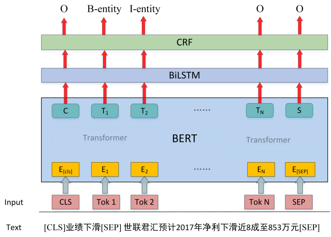 我们采用的基于CRF的实体识别模型主要结构为,把输入文本传入预训练BERT模型,将BERT输出传入单层双向LSTM模型,再将LSTM输出接CRF层,预测序列标注结果。