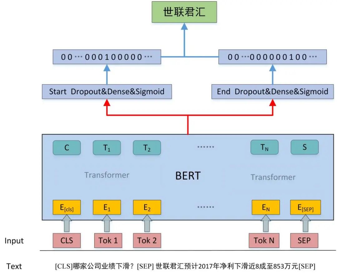 输入文本构建:由于我们的模型每一次需要把一段文本某个事件类型下的全部事件主体找出,因此输入文本应该包含事件类型和原文文本两部分,实际实现时,我们采用了CLS + 事件类型 + SEP + 原文 + SEP形式。