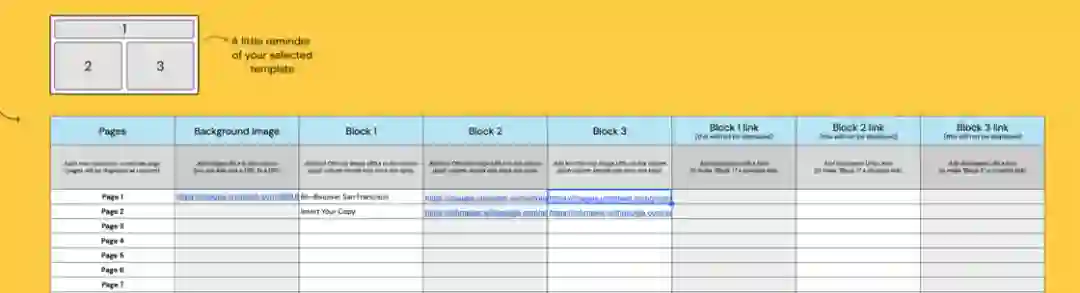 表格中每一行都代表着一个标签页,我们可以为其添加上页面的背景图片、在每个区块中添加上我们想添加的文字或图片(图片需为链接的形式)