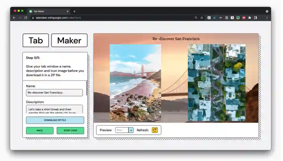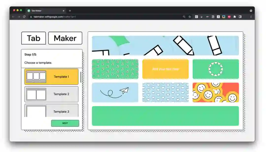 在 Google 的设想里,创建 Tab Maker 产品的初衷是为了在这个每天都有无数标签页被打开的时代里,让大家都能无门槛地利用这个平台去与他人分享自己的 idea 或是各种喜爱的事物,例如其给出的四个范例便包含在标签页中建立有关银河星系的画廊来探索学习银河系的奥秘、查看网络上各种可爱的猫猫狗狗、欣赏新生艺术家的作品并获得灵感、从本地的独立商户获取最新的信息和近况等等。