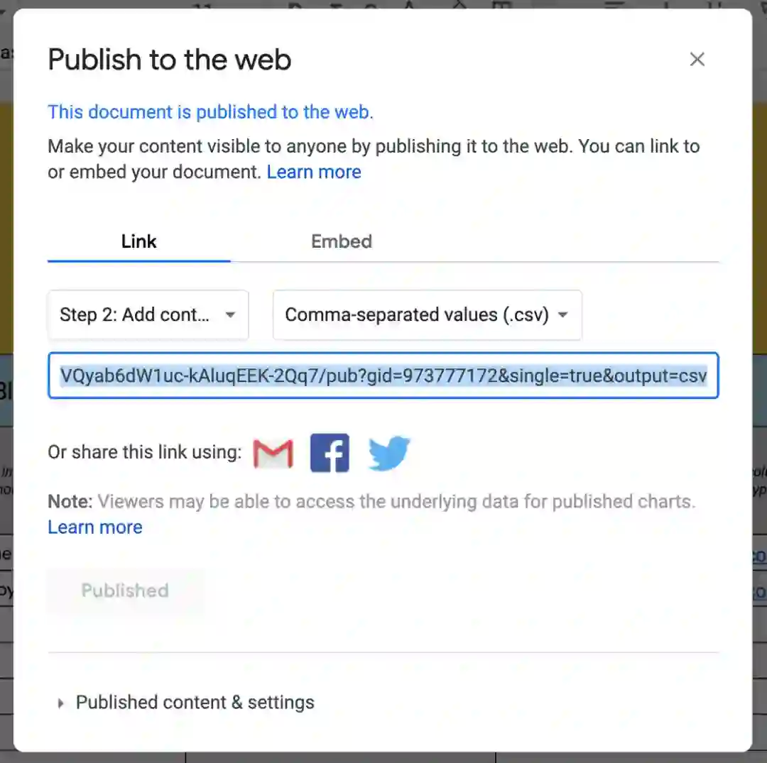 :依次点击左上角菜单 File > Share > Publish to web,并在弹出的对话框里的两个下拉菜单中分别选择第二份副表 Step 2: Add content to this sheet 和 .csv 格式 Comma-separated values (*.csv),最后点击发布(Publish)按钮即可。