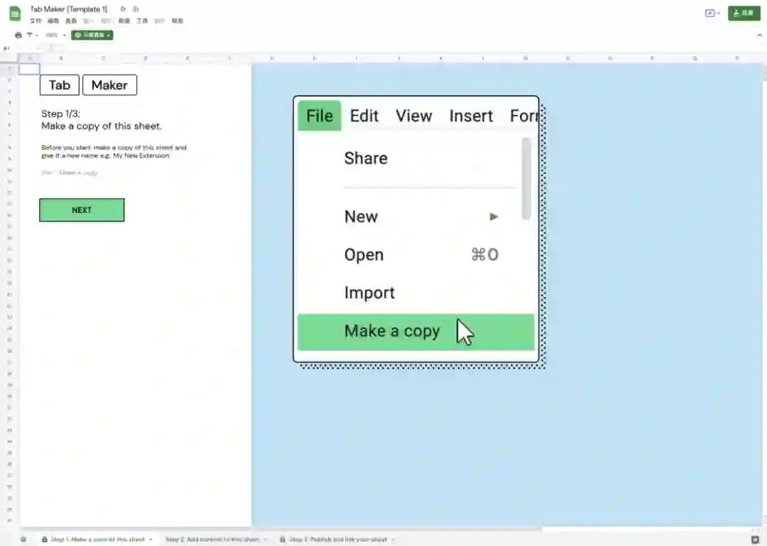 随后 Tab Maker 会引导我们创建一个用于页面内容搭建的 Google Sheet 表格模板。我们此刻需要做的是生成一份这份表格的副本,并将其保存到自己的 Google Drive 存储中。