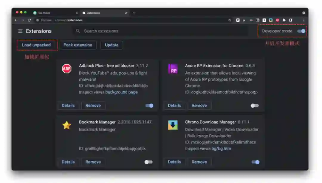 以 Chrome 为例:打开 Chorme 的扩展设置页面,开启开发者模式,然后点击加载扩展包,