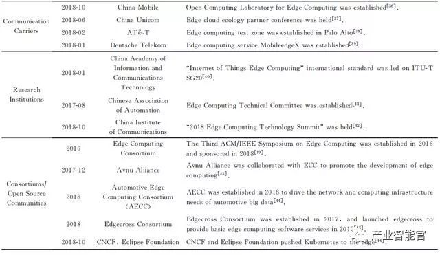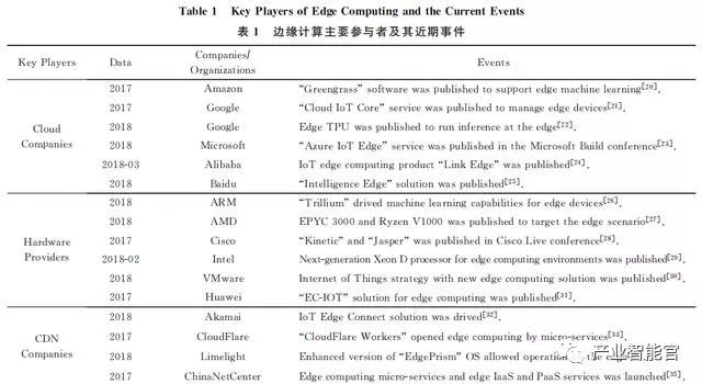 2018年是边缘计算发展过程中的重要节点,尽管此前业内已经对边缘计算报以了很大期望,而 2018年边缘计算被推向前台,开始被大众熟知。这一阶段,边缘计算的参与者范围扩大很快,如表1所示,参与者已经基本涵盖了计算机领域的方方面面,本文将它们分为6类:云计算公司、硬件厂商、CDN 公司、通信运营商、科研机构和产业联盟/开源社区,并在表1中列举它们近2年在边缘计算领域的事件。