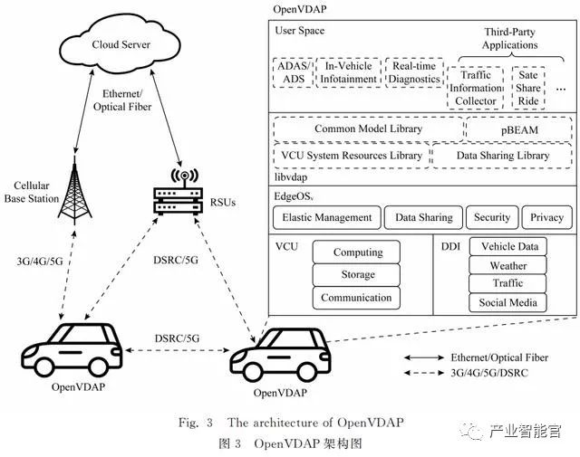 以智能网联车场景为例,车辆逐渐演变成一个移动的计算平台,越来越多的车载应用也被开发出来,车辆的各类数据也比较多。由.Zhang等人提出的OPenVDAP是一个开放的汽车数据分析平台,如下图3所示,Open VDAP分成4部分,分别是异构计算平台(VCU )、操作系统(EdgeOSv)、驾驶数据收集器(DDI)和应用程序库(libvdap),汽车可安装部署该平台,从而完成车载应用的计算,并且实现车与云、车与车、车与路边计算单元的通信,从而保证了车载应用服务质量和用户体验.因此,在边缘计算不同的应用场景下,如何有效地管理数据、提供数据分析服务,保证一定的用户体验是一个重要的研究问题。