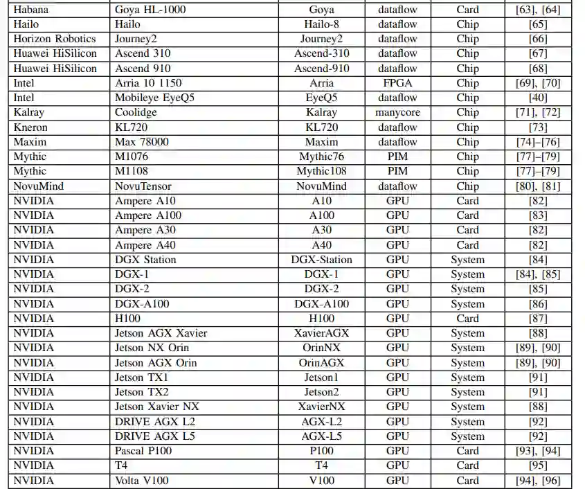 有许多综述[13]-[24]和其他论文,涵盖了AI加速器的各个方面。例如,这项多年调查的第一篇论文包括某些AI模型的FPGA的峰值性能;然而,上述的一些调查深入地涵盖了FPGA,因此它们不再包括在本次综述中。这项多年的综述工作和本文的重点是收集一个全面的人工智能加速器的列表,其计算能力,电力效率,并最终在嵌入式和数据中心应用中使用加速器的计算效率。随着这一重点,本文主要比较神经网络加速器是有用的政府和工业传感器和数据处理应用。在前几年的论文中包含的一些加速器和处理器在今年的调查中被排除在外。它们被丢弃了,因为它们被同一家公司的新加速器超越了,它们不再被提供,或者它们不再与主题相关。
