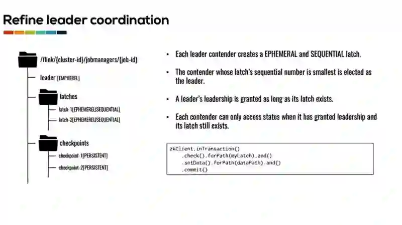 为了上述问题,我们对 Flink 的 leader 选举和发布进行了重构。我们要求每个 master 节点在竞争 leader 时都创建一个 EMPHEMERAL 和 SEQUENTIAL 的 latch 节点。之后所有 master 节点会检查 latch 目录下所有的节点,序列号最小的那个节点将会被选举为 leader。