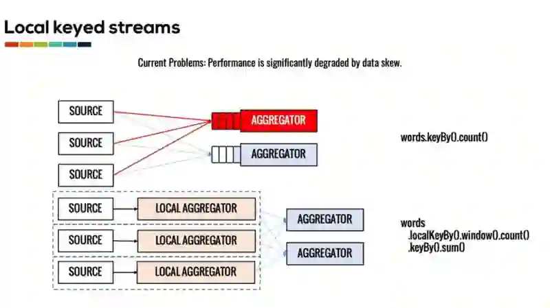 为了解决负载倾斜的问题,我们提供了 Local Keyby 算子,允许用户在 task 本地对数据流进行划分。划分得到的 Local keyed streams 和一般的 Keyed streams 是类似的。用户可以通过 RuntimeContext 访问 keyed state,也可以在数据流上执行窗口操作。利用 Local keyed streams,我们就可以在数据发送一端就进行本地的预聚合,统计一定时间段内 word 在当前 task 出现的次数。这些预聚合的结果然后被发送给下游,通过合并得到最终的结果。
