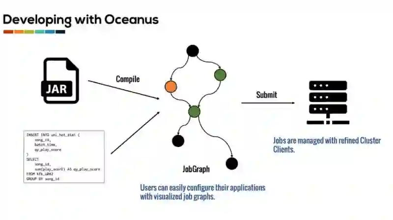 Oceanus 同样也提供了 SQL 和 Jar 的方式来开发实时计算作业。在使用 SQL 和 Jar 进行开发时,一个比较麻烦的地方就是作业的配置问题。例如 SQL 脚本没有提供任何方式来允许用户进行作业资源配置。尽管 Flink 的 DataStream API 为用户提供了接口来修改并发度和资源等配置,但为了灵活修改这些配置,用户常常需要自己通过外部配置文件的进行处理。为了用户能够在使用 SQL 和 Jar 进行开发时也能方便的进行作业配置,Oceanus 会首先对用户提交的 SQL 脚本和 JAR 包进行解析和编译,生成作业执行的 JobGraph,并可视化在页面上。用户之后可以根据可视化的 JobGraph 来进行作业配置。通过提供可视化的配置方式,用户作业开发的效率可以得到极大的提高。