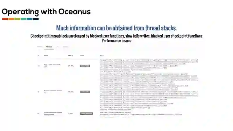 在即将发布的新版 Oceanus 中,我们还对 TaskExecutor 的线程信息进行了采集。这些线程信息能够很好地帮助用户定位发生的问题。例如 checkpoint 可能会由于多种多样的原因而超时。当用户实现的 source function 在被 IO 或者网络堵塞时并没有释放 checkpoint 锁,那么正在执行的 checkpoint 可能就会由于无法及时获取锁而超时。用户也有可能实现了一个堵塞的 checkpoint 函数,由于较慢的 HDFS 写入或者其他原因而导致 checkpoint 超时。通过观察线程信息,我们就可以容易的知道 checkpoint 超时的原因。