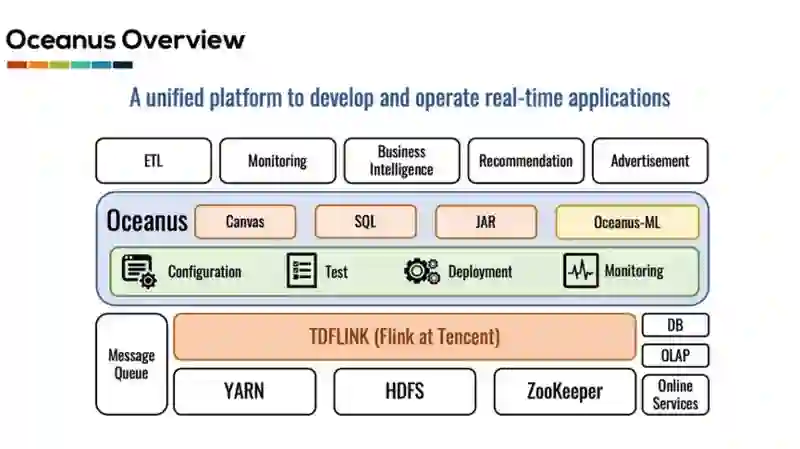Oceanus 还研发了 Oceanus-ML 来提高在线学习任务的开发效率。Oeanus-ML 提供端到端的在线机器学习,涵盖数据接入,数据处理,特征工程,算法训练,模型评估,模型部署整个机器学习流程。通过 Oceanus-ML,用户可以方便地利用完备的数据处理函数,丰富的在线学习算法来构建自己的在线学习任务,轻松地完成模型训练和评估,同时可以一键部署模型,管理模型的整个生命周期。