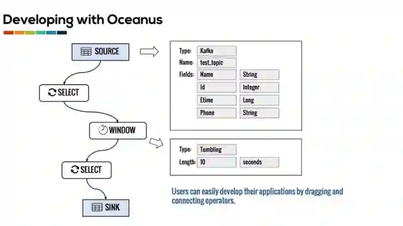 大部分 Oceanus 的用户可以使用画布方便的构建他们的实时计算应用。Oceanus 提供了常见的流计算算子。在开发实时计算应用时,用户将需要的算子拖拽到画布上,配置这些算子的属性并将这些算子连接,这样就构建好了一个流计算应用。这种构建方式十分简单,不需要用户了解底层实现的细节,也不需要掌握 SQL 等语言的语法,使得用户能够专注于业务逻辑。