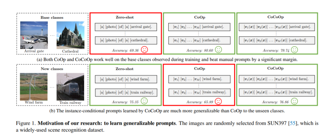 随着功能强大的预训练视觉语言模型(如CLIP)的兴起,研究如何使这些模型适应下游数据集变得非常必要。最近提出的一种名为上下文优化(CoOp)的方法将提示学习的概念引入视觉领域,以适应预训练的视觉语言模型。具体来说,CoOp将提示中的上下文单词转换为一组可学习的向量,并且仅使用少量标记的图像进行学习,可以在经过大量调整的手动提示中实现巨大的改进。在我们的研究中,我们确定了CoOp的一个关键问题: 学习的上下文不能泛化到同一数据集内更广泛的不可见类,这表明在训练期间观察到的CoOp基类过拟合。为了解决这个问题,我们提出了条件上下文优化(CoCoOp),它通过进一步学习一个轻量级神经网络来为每幅图像生成一个输入条件标记(向量)来扩展CoCoOp。与CoOp的静态提示相比,我们的动态提示适应每个实例,因此对类迁移不那么敏感。大量的实验表明,对于不可见的类,CoCoOp的泛化效果要比CoOp好得多,甚至在单个数据集之外还显示出很好的可迁移性; 具有较强的域泛化性能。代码可在https://github.com/ KaiyangZhou/CoOp